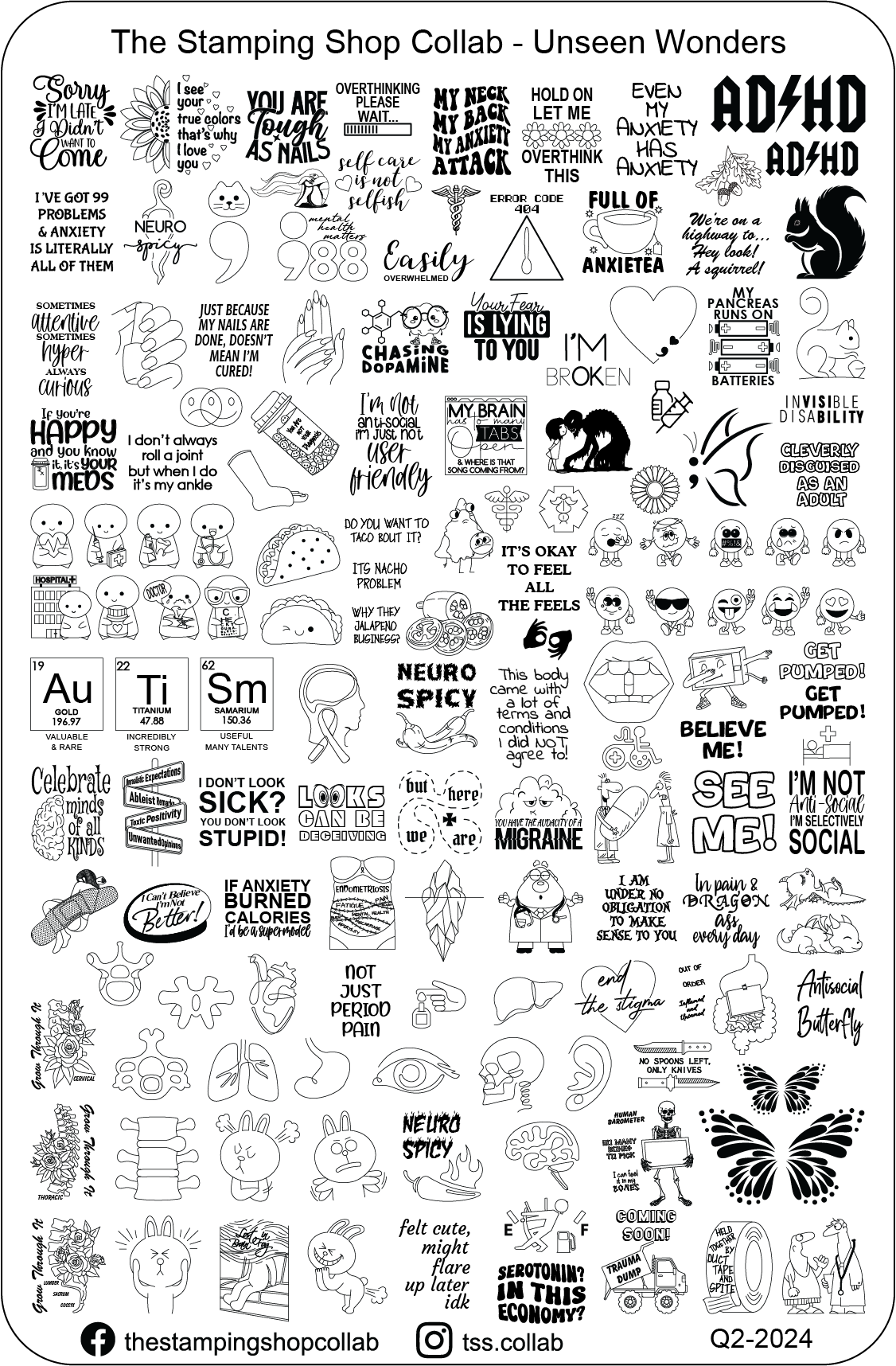 Discover the hidden beauty within with our "Unseen Wonders" stamping plate! This collection is a heartfelt homage to the invisible battles many of us face daily. From neurodivergence and mental health to diabetes, mobility, and more, this plate features a variety of designs that shine a light on these often unseen struggles.